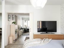 Tässä läpitalon kolmiossa on valoisat tilat ja ilmava tunnelma. HISSITALON toisen kerroksen asunnon parasta antia on erittäin tilava olohuone/ruokailutilan yhdistelmä sekä niin ikään tilava päämakuuhuone isolla peililiukuovikaapistolla. Olohuoneen jatkona on myös oma PARVEKE sisäpihalle päin, ja näkymät ovat kivat molemmin puolin. Erillinen keittiö on toimiva runsaine kaappi- ja pöytätiloineen, ja halutessaan sinne saa mahtumaan myös pienen aamiaispöydän. Kylpyhuone on siisti, ja niin ikään toimiva kokonaisuus. Kahden makuuhuoneen koti on viihtyisä ja kutsuva, ja sijainti kerrassaan loistava!