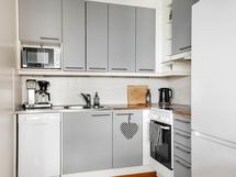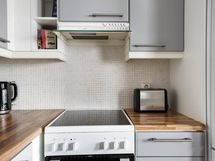 Jääkaappipakastin (uusittu 2025), keraaminen liesi (uusittu 2025), liesituuletin, astianpesukone, kaapistot.