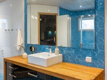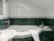 - Erillisen WC:n kuvaus: Yläkerrassa poreamme/kylpyamme, jossa suihku, peilikaappi, allaskaapisto, pesuallas, wc-istuin.
