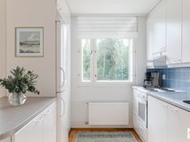 - Kodin keittiö on selkeälinjainen ja ajaton kokonaisuus. Valkoiset kaapistot tuovat tilaan valoisuutta ja keveyttä, ja yläkaapit tarjoavat runsaasti säilytystilaa. Kodinkoneina ovat jääkaappipakastin, sähköliesi, liesituuletin sekä astianpesukone. Keittiössä on hyvin laskutilaa arjen ruoanlaittoon, ja lattian vaalea vinyylimatto tekee tilasta helppohoitoisen ja käytännöllisen.