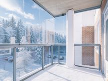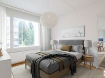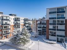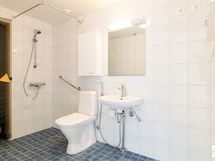 - Pesutilojen kuvaus: Kylpyhuone on kokonaan laatoitettu. Varusteluun kuuluvat suihku, käsienpesuallas, peili, wc-istuin sekä bidee. Tilassa on myös paikka pesutornille, mikä helpottaa arjen askareita ja tekee pyykinpesusta vaivatonta.
