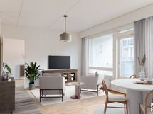 Keittiön yhteyteen ja olohuoneen viereen on luonteva paikka ruokapöydälle, jolloin ruokailu sujuu vaivattomasti osana kodin arkea.