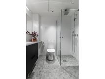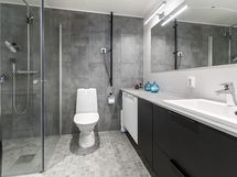 - Pesutilojen varusteet: WC-istuin, suihkukaappi, pesukoneliitäntä, peili, lattialämmitys, suihku ja kiinteät valaisimet. Pesutilojen kuvaus: 2 kpl, toisessa pesukoneliitäntä.