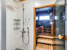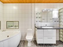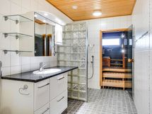 - Kylpyhuone, jossa poreamme, peilikaappi, allaslaatikosto, wc, suihku, lasitiiliseinäke, lasihyllyt. Saunassa pilarikiuas, muotolauteet ja laudetasoon upotettu vesiastia valolla sekä ikkuna.