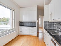 - Kaapistot, jääkaappi, pakastin, erillisuuni- ja taso, liesituuletin, astianpesukone. Lattia: Parketti. Seinät: Maalattu, välitila laatoitettu