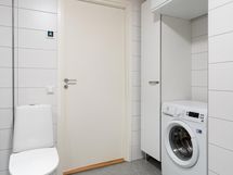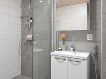 Kylpyhuoneessa on wc-istuin, suihku, suihkuseinä, peilikaappi, allaskaappi, pesukoneliitäntä, lattialämmitys.