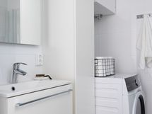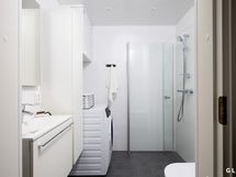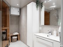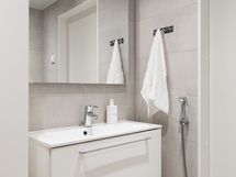 - Varusteet: WC, suihku, pesukoneliitäntä, lattialämmitys, kiinteät valaisimet, suihkuseinä, peili, allaskaappi. Asuntiloissa on kaksi kylpyhuonetta ja molempien kylpytilojen yhteydessä on wc, pesukoneliitäntä sekä säilytyskaappi. Isomman kylpyhuoneen yhteydessä on myös pyyhekuivain.