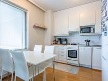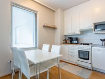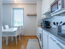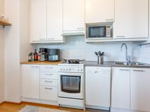 - Keittiön varusteet: Jääkaappipakastin, liesituuletin, astianpesukone ja kiinteät valaisimet. Liesi: Keraaminen liesi. Työtason materiaali: Laminaatti.