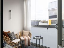 Asunnolla on kaakonsuuntainen tilava lasitettu parveke, josta on näkymät rauhalliselle, kauniisti kivetetylle Kokinpellonraitille.