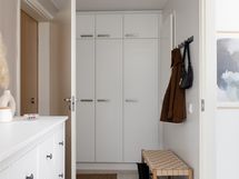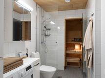 Allaskaappi, peilikaappi, pyykkikaappi, suihkuseinä, suihku, bidee-suihku, pesukoneliitäntä ja paikka pesutornille, sähköinen lattialämmitys.