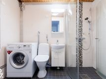 - Pesutilojen varusteet: Pesuallas, wc-istuin, suihku, pesukoneliitäntä, peili, bidee-suihku ja pesukone. Pesutilojen kuvaus: Pyykinpesukone jäisi paikalleen.