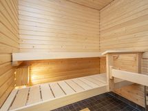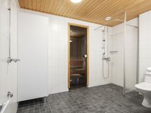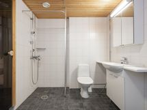 - Kylpyhuoneessa on suihku,suihkuseinä,wc istuin,bideesuihku,allaskaappi,peilikaappi korkea kaappi ja pesukoneliitäntä. Kylpyhuoneessa lisäksi mukavuuslattialämmitys. Saunassa on lauteet ja sähkökiuas.