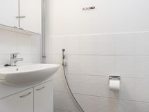 Erillisessä wc:ssa on wc-istuin, bideesuihku, allaskaappi ja peilikaappi. - Säilytystilat