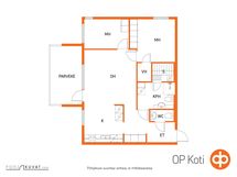 - Keittiö: parkettilattia/välitilan laatta. Olohuone: parkettilattia/maalattu ja tapetoitu. Makuuhuone 1: parkettilattia/maalattu ja tapeoitu. Makuuhuone 2: parkettilattia/maalattu/tapetti. Sauna: puupaneloitu seinät ja katto/laattalattia. Kylpyhuone: laatta/laatta. Eteinen: parkettilattia/maalattu seinät. Wc: laatta/laattaseinä puoleen väliin.