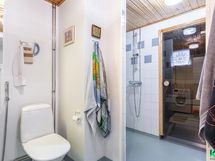 - Sauna, saunassa ikkuna. Kylpyhuone, suihku, kiinteä suihkuseinä, wc-istuin, peilikaappi, pesukoneliitännät, korkeakaappi, huoneistokohtainen IV-kone. Erillinen wc, peilikaappi, allaskaappi.