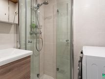 - Kylpyhuone: suihku, kääntyvät suihkuseinäkkeet, wc-istuin, allas, allaskaappi, peilikaappi, pesukoneliitäntä, kiinteät valaisimet.