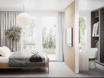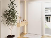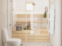 - Kylpyhuoneet ja pesutilat laatoitetaan, ja saunat paneloidaan. Saunan ja pesuhuoneen välinen lasiseinä tuo tilaan avaruutta ja modernia ilmettä. Kodinhoitotiloissa on varaukset sekä pyykinpesukoneelle että kuivausrummulle.