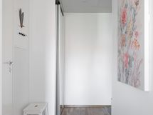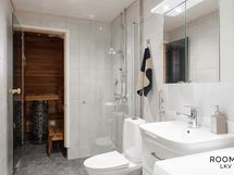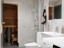 Varustus: suihkuseinä, pesukoneliitäntä, lattialämmitys, wc-istuin, suihku, peilikaappi.