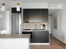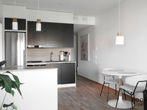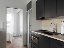 Työtasot: laminaatti. Jääkaappipakastin, integroitu astianpesukone, monitoimiuuni mikrotoiminnolla, induktioliesi ja liesikupu.