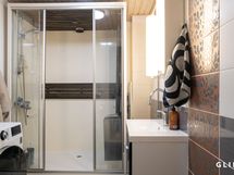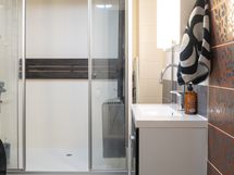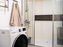 Pesutilojen kuvaus: Kompakt-sauna/suihkukaappi. Varustus: pesukoneliitäntä, wc-istuin, suihku.