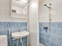 - Kylpyhuoneessa on WC-istuin, peilikaappi, käsienpesuallas, bide-suihku, kiinteä valaisin, suihku, suihkuseinä, pesukoneliitäntä