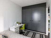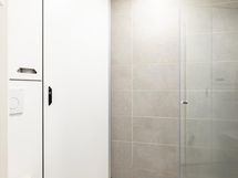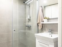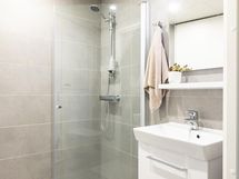 Kylpyhuoneesta löytyy suihku, peilit, kaapit, allaskaappi, pesukoneliitäntä, lattialämmitys ja kiinteät valaisimet.