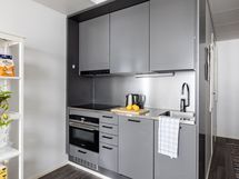Keittiön varusteina ovat jääkaappipakastin, erillisuuni, jossa on mikrotoiminto, keraaminen liesitaso, liesituuletin, astianpesukone, kaapistot ja kiinteät valaisimet.