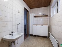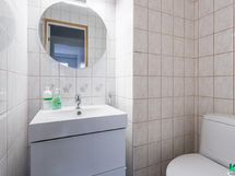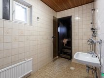 - Erillinen wc, jossa wc-istuin, allaslaatikosto ja peili. Kalusteet uusittu 2024 (pl. wc-istuin), wc-pintaremontoitu 1990-luvun lopulla. Seinät ja lattia laattaa. Kylpyhuoneessa suihku, lavuaari, kylpyhuonekaapisto (uusittu 2024), pesukoneliitäntä (tulo). Seinät ja lattia laattaa. Kph remontoitu 1990-luvun lopulla. Sähkösauna, jossa seinät paneelia, lattia laattaa. Saunassa ikkuna. 2025: kaikki saunan pinnat käsitelty sävyttävällä saunasuojalla.