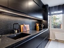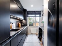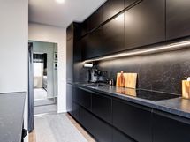 - Jääkaappi/pakastin side-by-side, erillisuuni- ja taso (induktio), astianpesukone, mikroaaltouuni, liesituuletin filtterillä, kaapistot, kiinteät valaisimet
