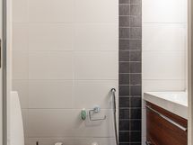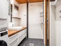 Varustus: kaapistot, allaskaappi, peili, pesukoneliitäntä, suihku, lattialämmitys ja kiinteät valaisimet.