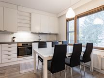 - Todella tilava ja valoisa keittiö, jossa on runsaasti kaapistotilaa sekä tila myös isolle ruokapöydälle.
