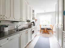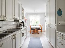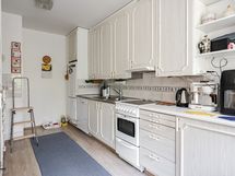 - Keittiön varusteet: Astianpesukone, jääkaappipakastin ja liesituuletin. Liesi: Keraaminen liesi. Työtason materiaali: Laminaatti.