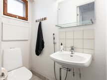 Materiaalit: Lattia- ja seinäpinnat laatoitettu. Erillisten WC:n lukumäärä: 1. Erillisen WC:n kuvaus: Varustus: WC-istuin, bidee, lavuaari, peili ja kiinteät valaisimet.