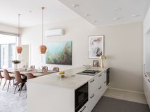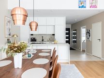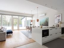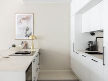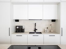 Keittiön varusteet: Jääkaappi, erillinen pakastin, liesi, erillisuuni, liesituuletin, mikroaaltouuni ja astianpesukone. Liesi: Induktioliesi. Työtason materiaali: Kivi.