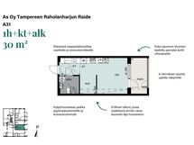 Kuudennen kerroksen selkeälinjainen ja helposti kalustettava yksiö, melkein kuin kaksio, seinällä erotetun alkovin ansiosta. Alkovin mitat ovat noin 1,8m x 2,1m. Näkymät avautuvat idän puolen puistoalueeseen. Iso lasitettu parveke puistoalueen suuntaan.