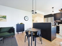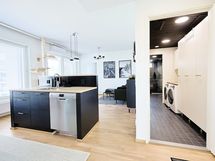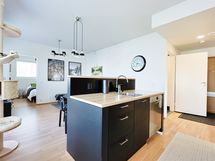 - Keittiön varusteet: Keittiösaareke, astianpesukone, mikroaaltouuni ja erillisuuni. Liesi: Induktioliesi. Tyylikäs keittiö. Kaapistot ja laatikostot sekä saareke, jossa on astianpesukone, allas ja hana. Rosteriset täyskorkeat jääkaappi ja pakastinkaappi. Induktio liesitaso ja kiertoilmauuni, liesituuletin ja mikro. Lattia tammiparketti.