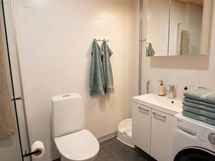 Suihku, Suihkuseinä, Pesukonevalmius, Peilikaappi, Allaskaappi, Laattalattia, Laattaseinä, Lattialämmitys