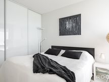 Harmoninen makuuhuone tarjoaa erinomaiset puitteet rauhoittumiseen ja lepoon. Makuuhuoneesta löytyy hyvin säilytystilaa kaapistoista ja näkymät ovat ikkunasta järvelle ja vehreälle, suojaisalle sisäpihalle.