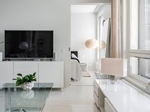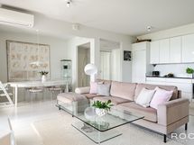 Avara ja yhtenäinen olohuone-keittiötila on saatu toteutettua siten, että toinen makuuhuone on poistettu muutostyönä ja sulautettu olohuonetilaan, joka on toteutettu rakennusaikaisena muutostyönä. Kokonaisuus on erittäin onnistunut ja vaikuttava. Tilaan saa luontevasti sijoitettua sohvaryhmän ja 4-6 hengen ruokailuryhmän. Olohuoneesta on käynti tilavalle lasitetulle parvekkeelle, jonka maisemat avautuvat etelään, suoraan järvelle ja pienvenesatamaan päin.