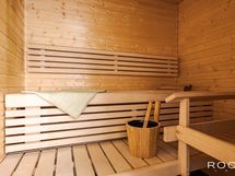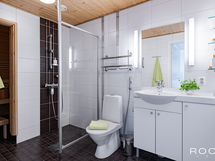 Kylpyhuone on laadukas, tyylikäs ja ajattomilla materiaaleilla sekä väreillä toteutettu. Tilaan on asennettu liukuovet, joiden takana on pyykkikaappi, tila pesutornille sekä pyyhekuivain. Mukavuuslattialämmitys on miellyttävä lisä ja pitää kylpyhuoneen lattian kosteuden poissa. Sauna on valmistettu laadukkaista materiaaleista ja säilytetty perinteisen puun värisenä.