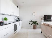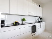 Asunnossa on nykyaikainen ja käytännöllinen avokeittiö, josta löytyy mm. integroidut kylmälaitteet, esteettisesti tyylikkäät ja kestävät kivitasot, keraaminen liesi sekä erillisuuni. Säilytystilaa ja laskutilaa on hyvin ja varustelu on kaiken kaikkiaan hyvätasoinen.