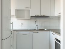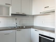 Liesi: keraaminen, integroitu. Työtasot: laminaatti. Kylmäsäilytys: jääkaappi/pakastin. Varustus: liesituuletin, astianpesukone.