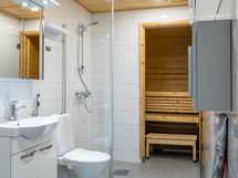 Pesutilojen kuvaus: tilavan kokoinen pesuhuone. Varustus: suihkuseinä, pesukoneliitäntä, lattialämmitys, wc-istuin, suihku, peilikaappi, kiinteät valaisimet.
