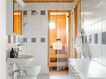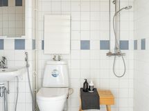 Suihkuhana vaihdettu 08/2011. Varustus: pesukoneliitäntä, lattialämmitys, wc-istuin, suihku, peilikaappi, kylpyhuonekaapisto.