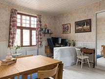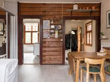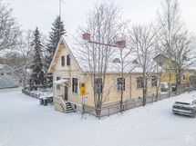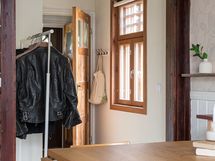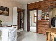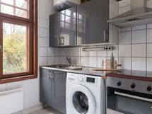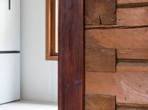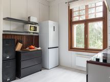 - Kaapistot, tiskipöytä, kaapistojen välitila laatoitettu. Lämminvesivaraaja, erillisuuni, keraaminen keittotaso, liesituuletin (aktiivihiili), PorinMatti kamiina ja jääkaappi/pakastin. Pesukoneliitäntä. Laminaattilattia. Maalatut levyseinät, osittain paneelia ja hirttä.