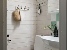 - Pesutilojen kuvaus: Laattalattia ja seinät laatoitetut/paneloidut. Lattialämmitys. Allas, allaskaappi, peilikaappi, wc-istuin ja suihku.