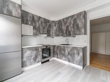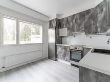 Varusteet: Jääkaappipakastin, Astianpesukone, Integroidut kodinkoneet. Työtaso: Laminaattitaso. Liesi: Sähköliesi, Liesituuletin hormilla. avokeittiö