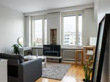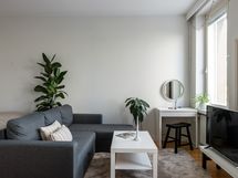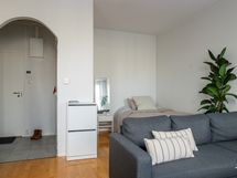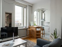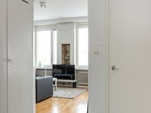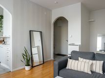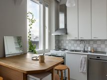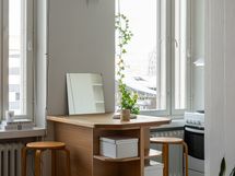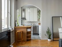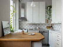 Keittokomeron ja olohuoneen välissä niemeke, mikä toimii kätevästi ruokapöytänä.