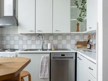 Jääkaappi, astianpesukone, liesi, liesituuletin, pesuallas, keittiöhana.