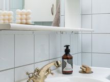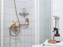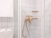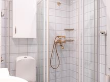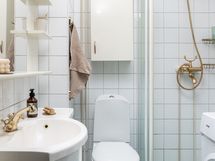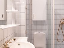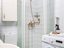 Suihku, suihkuseinät, wc-istuin, pesuallas, pesuallas, allaskaapisto, hana, peili, pesukoneliitäntä. Kiinteät valaisimet. .